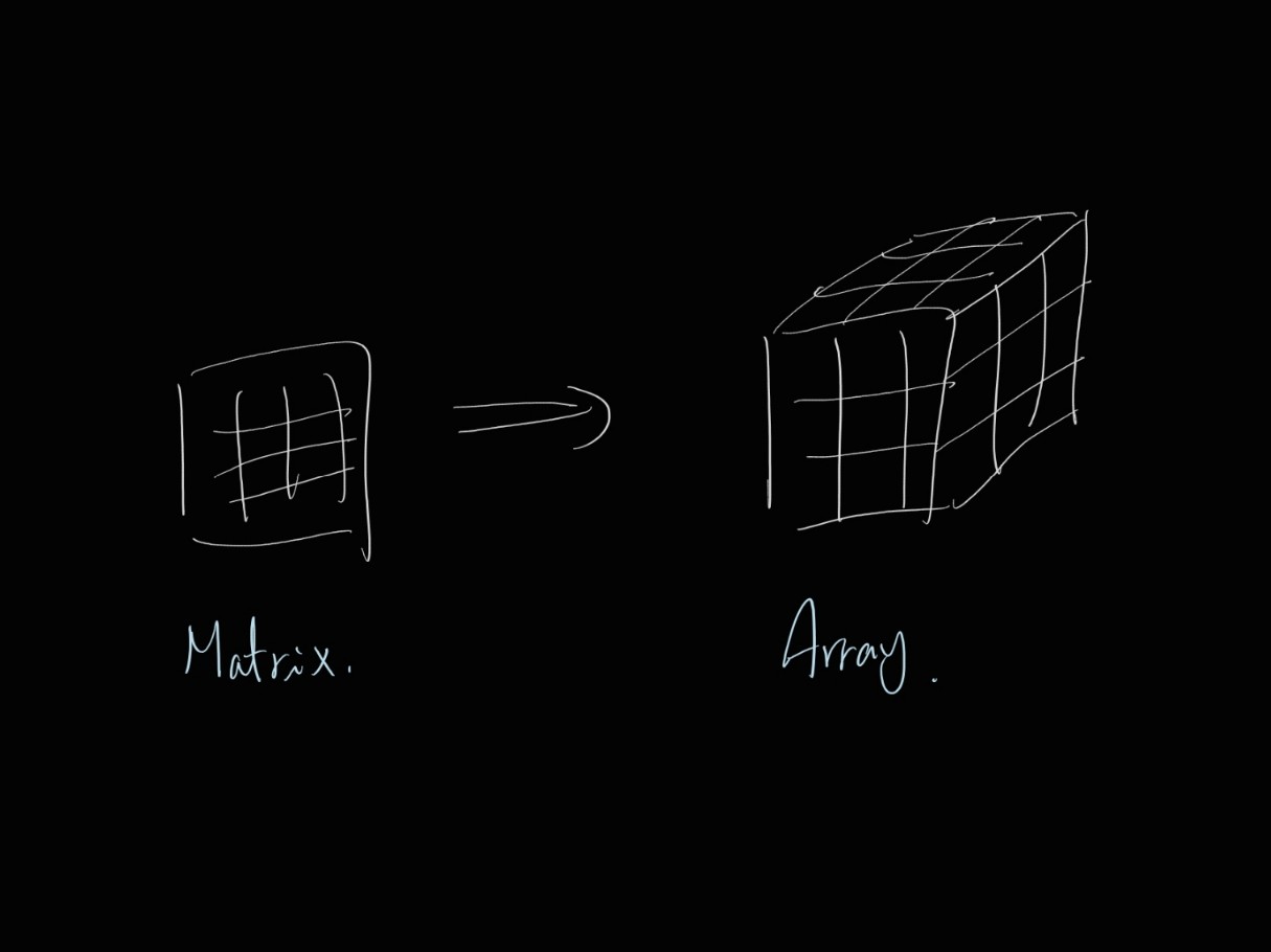 이렇게, 다층적으로 2차원 데이터를 묶은 형태를 '어레이(array)' 라고 합니다. 아래와 같은 3차원의 데이터 공간을 생각하시면 됩니다.
