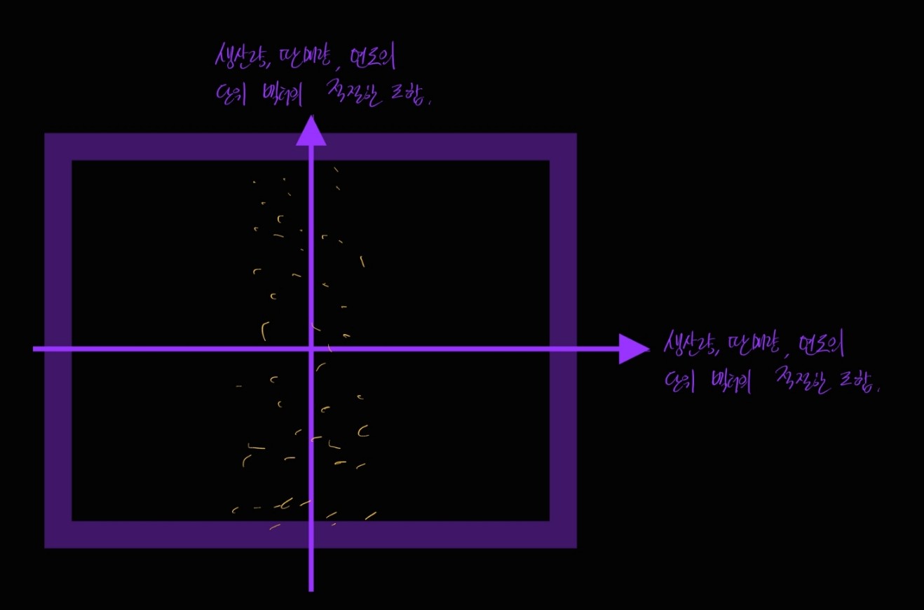예를 들어, 위에서 그려드렸던 3차원 데이터의 X, Y, Z축이 각각 "년도", "생산량", "판매량" 을 각각 의미한다고 해 볼게요.