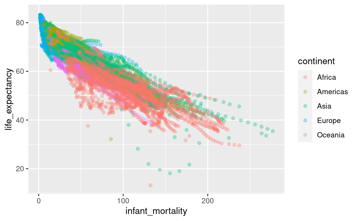이 스캐터 플롯은 x축, y축이 연속 데이터, 색깔에 이산 데이터를 담아 내었습니다만, 그라데이션 팔레트를 사용하면 색깔에도 연속 데이터를 담아 낼 수 있습니다. 이렇게 세 가지 정보를 담아낸 플롯은 "3차원 데이터" 라고 할 거예요.