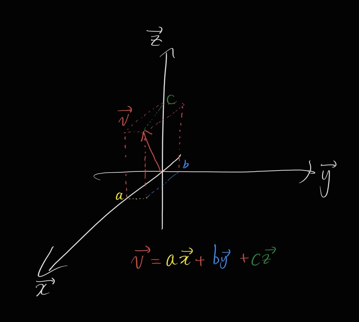 벡터 공간(여기서는 3차원 벡터를 예시로 쓰기 때문에, 그냥 좌표 공간을 의미합니다)의 임의의 벡터 v는 그 좌표 공간 안의 다른 벡터들의 합으로 표현할 수 있어요.