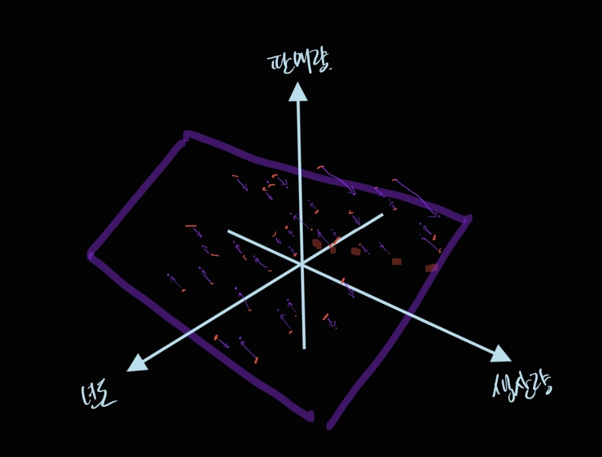 새로 만들어진 이 보라색 평면의 축은, 원래 데이터의 축인 '생산량', '판매량', '년도' 를 적당히 더해서 만들었습니다.
