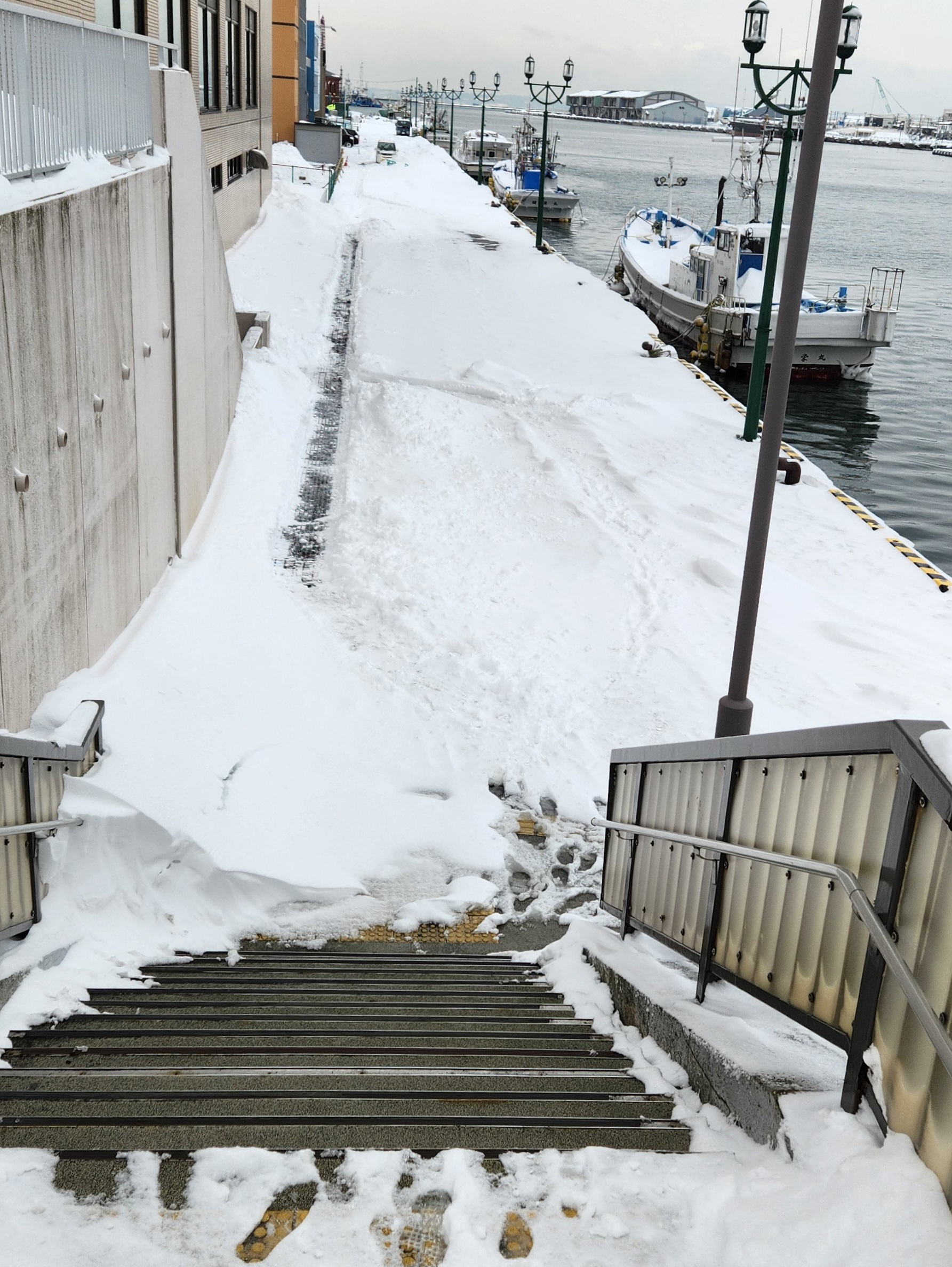그러나 아무래도 차로 생선들을 대량으로 실어나르는 통행이 많아서 그런지, 제설이 잘 되어있던 차도와는 다르게 인도는 전혀 제설이 되어있지 않았다.