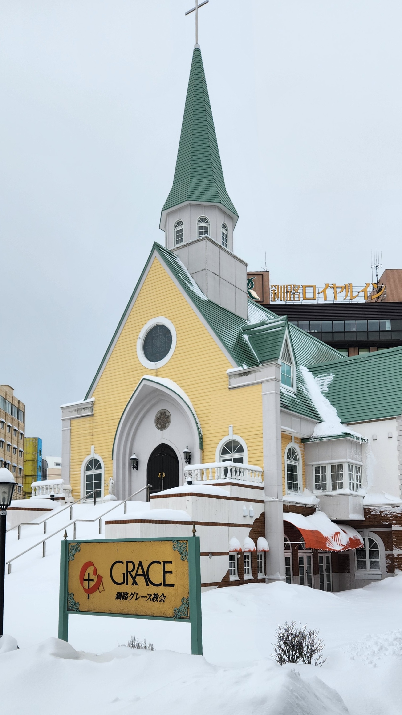 구시로 역에서 바깥으로 나오면 제일 먼저 만나볼 수 있는 그레이스 교회.